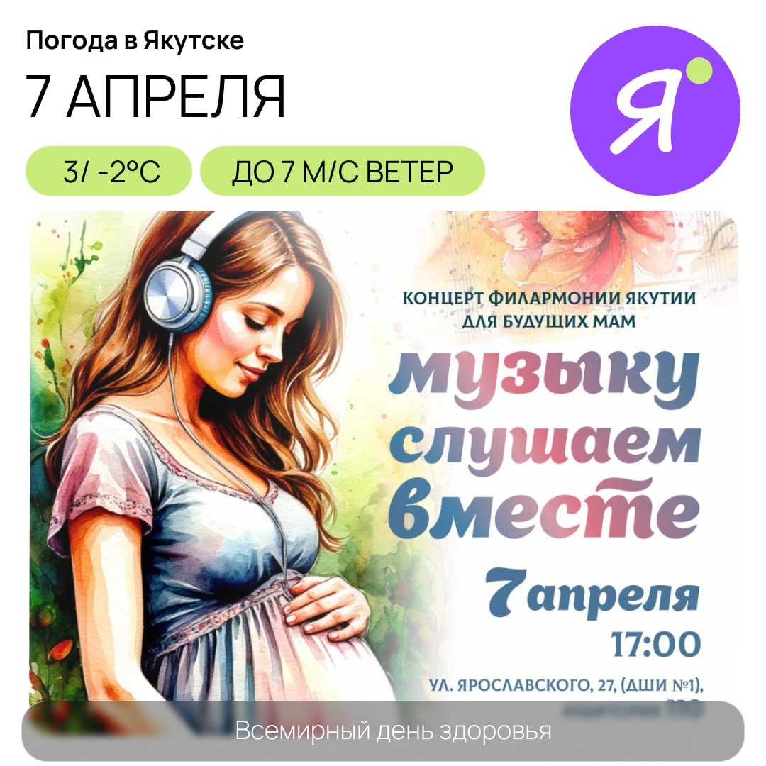 Доброе утро, с новой трудовой неделей 🤩 Филармония Якутии приглашает будущих мамочек на концерт в честь Дня беременных. Для вас выступят артисты Филармонии Якутии Наталья Соломонова (арфа), Алина Леонтьева (арфа), Айталина Сивцева (флейта), Сардана Шараборина (сопрано). Чарующие звуки арфы и флейты, положительно влияют на эмоциональное состояние и развитие ребенка. В программе — нежные мелодии Дебюсси, Чайковского, Баха и других. 🤩Сегодня в 17:00 Детская школа искусств №1, ул. Ярославского, 27, аудитория 110. 🤩ВХОД СВОБОДНЫЙ Телефон для справок: 8 (4112) 47-63-35 Online Якутия | Подписаться
