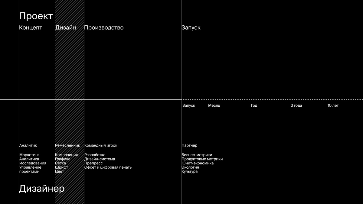 Очевидно, что работа заканчивается вместе с зоной ответственности специалиста, что для дизайнера, как правило — передача макетов на производство. Но я всегда находил этот ответ неудовлетворительным, потому что макетам нет применения, они бесполезны. Макет — это частичная визуальная документация проекта, не более того. Задача в итоге — сделать проект, а не документацию к нему. В начале своей карьеры мне хотелось сделать не просто красивый макет афиши или табличек для выставки, а увидеть эту афишу в городской среде, увидеть людей, её замечающих. Если дизайн — это язык, про коммуникацию, то я желаю видеть процесс этой коммуникации. Но можно пойти дальше. Коммуникация тоже призвана решать какую-то задачу. Донести мысль, обеспечить транзакцию от человека к человеку. Вербальную, психологическую, финансовую. Мне недостаточно просто увидеть сам факт реализации проекта, я хочу увидеть влияние проекта на людей и среду. Это привело меня к странной роли дизайнера-менеджера-продюсера. Но важный инс