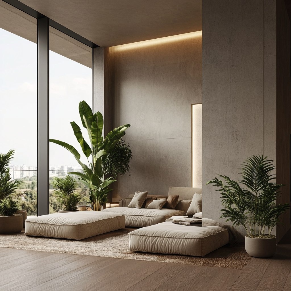 Создано на основе запроса: ultra réaliste appartement, very modern, minimalist, luxury style, with plants and big window