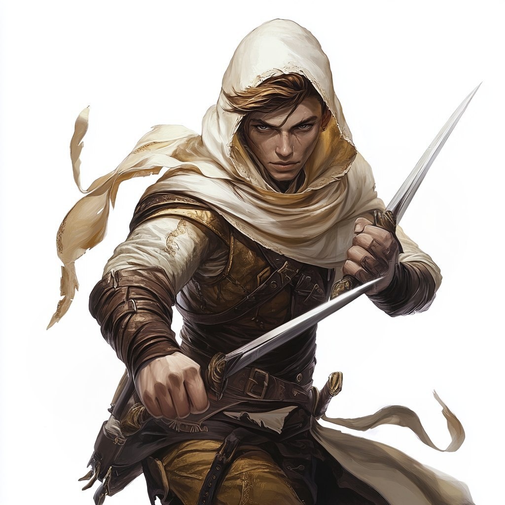 Создано на основе запроса: Fantasy concept illustration, Male, Human, Rogue, Stern, Hooded, No cloak, Leather armour, Two dagger in hands, Short golden brown hair, Octopath traveler style, White background, High quality, Exaggerated fighting pose --- Автоперевод: Фэнтезийная концепция иллюстрация, мужчина, человеческий, мошенник, строгий, капюшона, без плаща, кожаные брони, два кинжала в руках, короткие золотые коричневые волосы, стиль путешественника -осьминога, белый фон, высокое качество, преувеличенная боевая поза Хорошо выглядит? 🤔 https://dzen.ru/id/65c0c65c86e4f837c27b24d7 #ИИ #AI #нейросеть #midjourney #art