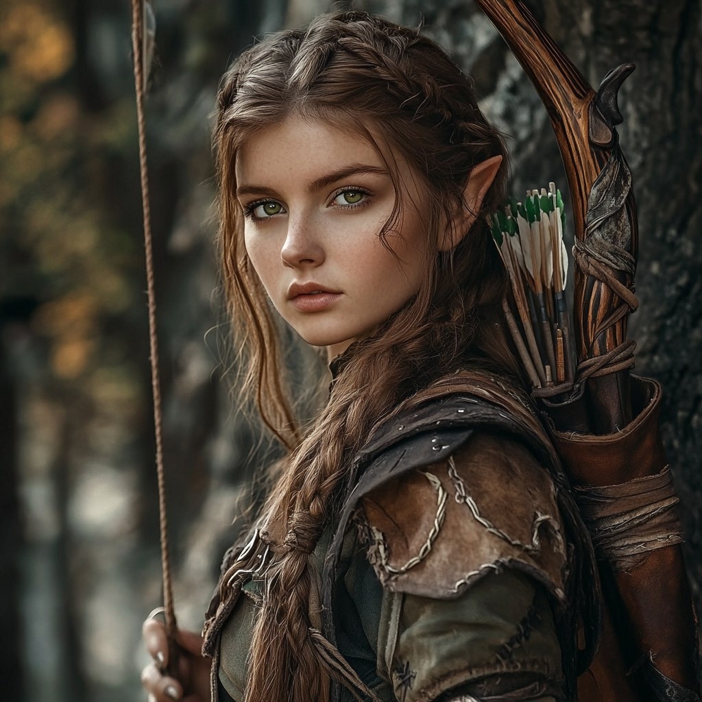 Создано на основе запроса: female wood elf, hunter, ranger, wearing hide armor, holding a long bow, light brown hair with green streaks, green eyes, fantasy character --- Автоперевод: Женский деревянный эльф, охотник, рейнджер, в шкуре, с длинными луками, светло -коричневыми волосами с зелеными полосами, зелеными глазами, фэнтезийным персонажем Красиво вышло? 🤔 https://dzen.ru/id/65c0c65c86e4f837c27b24d7 #ИИ #AI #нейросеть #midjourney #art