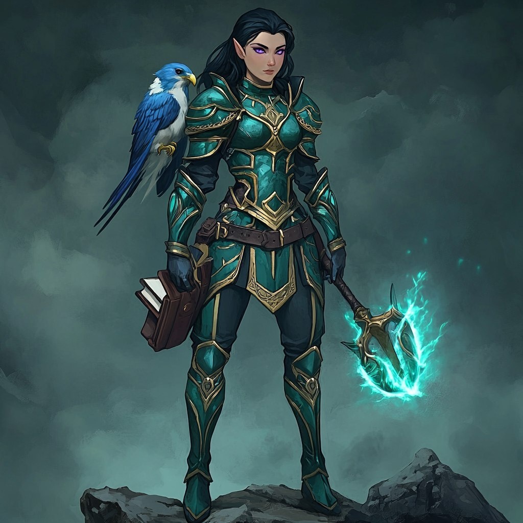 Создано на основе запроса: She stands confidently on a misty outcrop, clad in full plate armor that blends functionality with fantasy flair