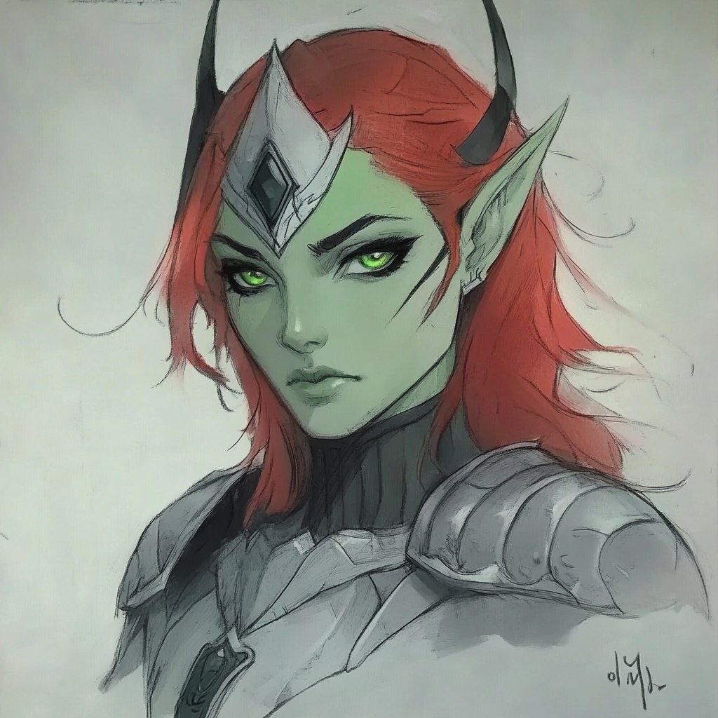Создано на основе запроса: Please draw a beautiful, green skinned war goddess based on these images. She has green blue eyes, with the whites of her eyes being black, and bright, fiery red hair. Her armor is dull gray still with a raven shine and lapis lazuli highlights. She has a serious but youthful face with a fearsome but cute expression. --- Автоперевод: Пожалуйста, нарисуйте красивую, зеленую кожную богиню, основанную на этих изображениях. Необычно получилось? 🤔 https://dzen.ru/id/65c0c65c86e4f837c27b24d7 #ИИ #AI #нейросеть #midjourney #art