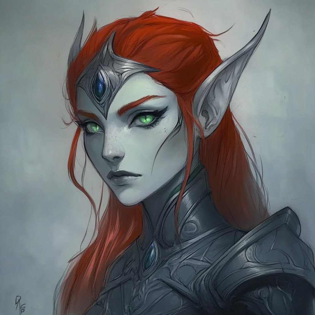 Создано на основе запроса: Please draw a beautiful, green skinned war goddess based on these images. She has green blue eyes, with the whites of her eyes being black, and bright, fiery red hair. Her armor is dull gray still with a raven shine and lapis lazuli highlights. She has a serious but youthful face with a fearsome but cute expression. She has pale white skin, like porcelean, paper, or snow. --- Автоперевод: Пожалуйста, нарисуйте красивую, зеленую кожную богиню, основанную на этих изображениях. Как тебе это изображение? 🤔 https://dzen.ru/id/65c0c65c86e4f837c27b24d7 #ИИ #AI #нейросеть #midjourney #art