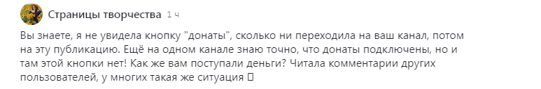 Здравствуйте, Люди! Тема "Донаты в Дзене" не исчерпана, а наоборот приобретает масштабный характер. С тех пор, как на платформе была введена функция донатов, у авторов стало появляться много вопросов. Я говорю это не понаслышке. Некоторые вопросы задавались и мне. Вот, например, меня спросили: Чтобы ответить на него, мне пришлось поискать информацию в блогах других авторов. А чтобы не отвечать каждому интересующемуся отдельно, я решала сегодняшний контент посвятить этой теме. Итак, давайте разбираться по порядку с самого начала. Инструкцию о том, как подключить донаты вы найдете у меня здесь: Казалось бы все просто. Все ясно и понятно. Но на деле оказалось, что , не так-то просто. Многие авторы этой кнопки не видят. Разбираясь в этой проблеме, поняла, что кнопку ДОНАТЫ не видят только те пользователи, которые заходят в Дзен со смартфонов. Если заходишь через компьютер, такой проблемы нет. Что говорят по этому поводу другие блогеры? А это ответ специалиста: То есть, чтобы со сма