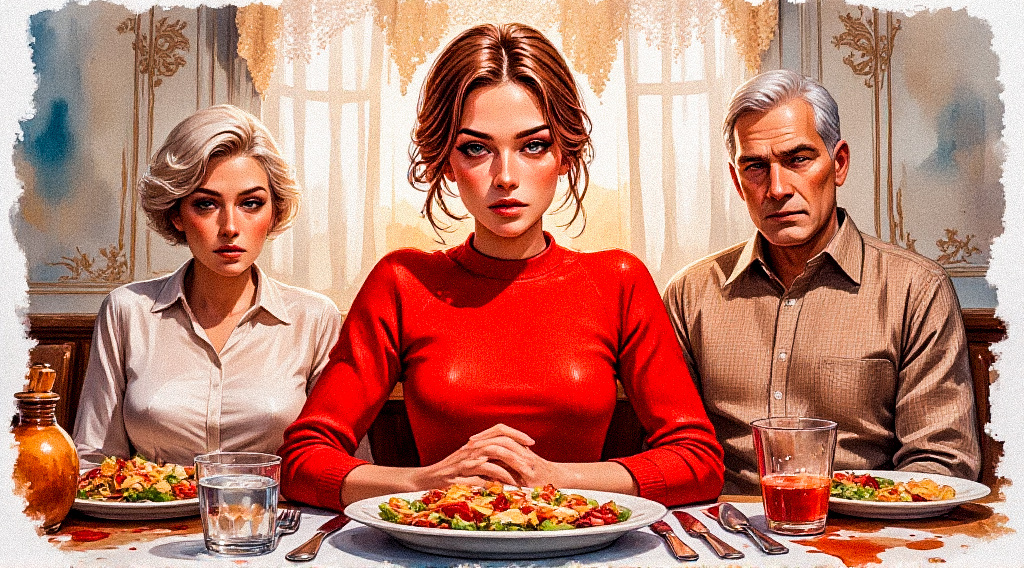 Светлана медленно опустила руку с телефоном, чувствуя, как румянец стыда заливает лицо. Родители сидели напротив, выжидающе глядя на нее. Мать уже успела заказать салат «Оливье» и бутылку «Советского» полусладкого. Отец нетерпеливо постукивал ложкой по столу.