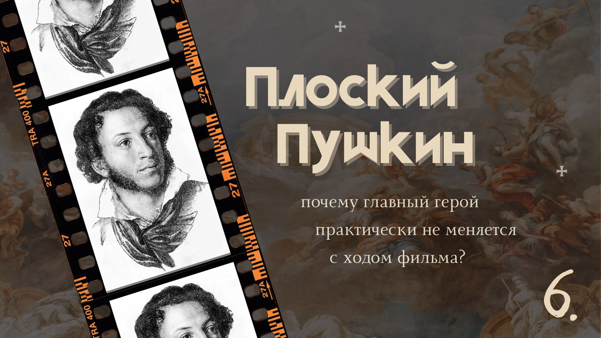 Феликс: Я изначально, подходя к этому сценарию, я размышлял, каким должен быть человек, чтобы стать “Пушкиным”? Должен ли он как-то меняться в течение своей жизни? Обычно мы привыкли к такой структуре, такой драматургической основе, когда мы видим героя, он… слабый, немощный, какой угодно, обладает не очень положительными качествами, проходит через определённый путь, и вот он вырастает, раскрывается перед нами и становится “властелином двух миров”. И это называется в драматургии “Арка героя”, и понятие “позитивная арка героя”: вот, он из плохого становится хорошим. Когда мы работали над этим сценарием, мы осознали в какой-то момент, что Пушкин не может меняться, Пушкин будто уже рождён с ощущением правды, с ощущением внутреннего стержня внутри. И мы поняли, что нужно использовать другую конструкцию для нашей картины. Это конструкция …, то есть, плоская арка, — когда герой изначально рождён таким, какой он есть, а все обстоятельства вокруг него пытаются проверить вот этот его внутренний стержень, сломается он или нет. И его оновная ставка – это удержать свой внутренний голос. Такую структуру мы видим в картине Пола Томаса Андерсона “There Will Be Blood” (рус.:“Нефть”). Тоже герой существует, будучи таким карьеристом, который всегда двигается вперёд, и ни одно событиего его… его пытаются раскачать, но он никогда не поддаётся. И вот тоже самое мы использовали в нашей картине, как структуру. Поэтому то, что Пушкин не меняется с точки зрения развития героя, он не меняется, потому что он рождён Пушкиным.