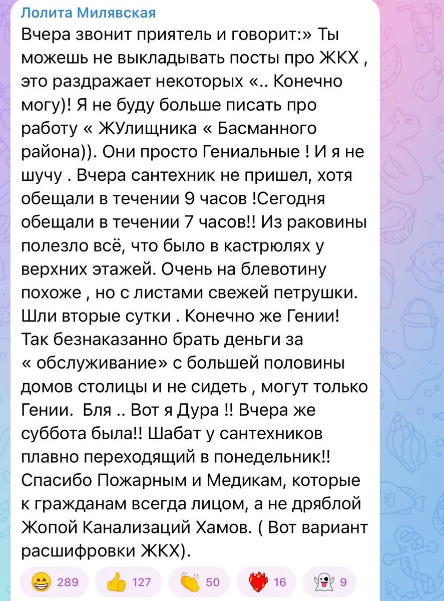 Лолита Милявская бахнула рюмочку и давай коммунальщиков по Телеграму гонять
