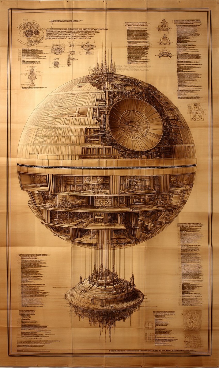 Создано на основе запроса: the Death Star, from star wars, schematics, side view, in extremelly detailed instructions of an underground