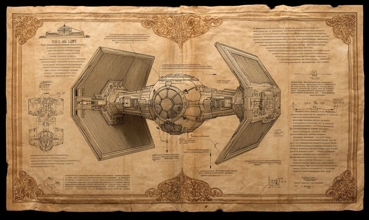 Создано на основе запроса: a Tie Fighter, from star wars, schematics, side view, in extremelly detailed instructions of an underground secret golden leaf papyrus, illuminated folio, ancient, with a technical project of Tie Fighter, black and white ambient occlusion map, craquelure style edges, gold filigree, by leonardo da vinci, with infographic, technical notes, sepia, worn out by time --- Автоперевод: боец галстука, из «Звездных войн», «Схемы», «Взгляд на сторону», «В экстремальных подробных инструкциях о подземном секретном золотом папирусе с золотистыми листьями», освещенным фолио, древним, с техническим проектом истребителя, черно -белого окружающей Хорошо выглядит? 🤔 https://dzen.ru/id/65c0c65c86e4f837c27b24d7 #ИИ #AI #нейросеть #midjourney #art