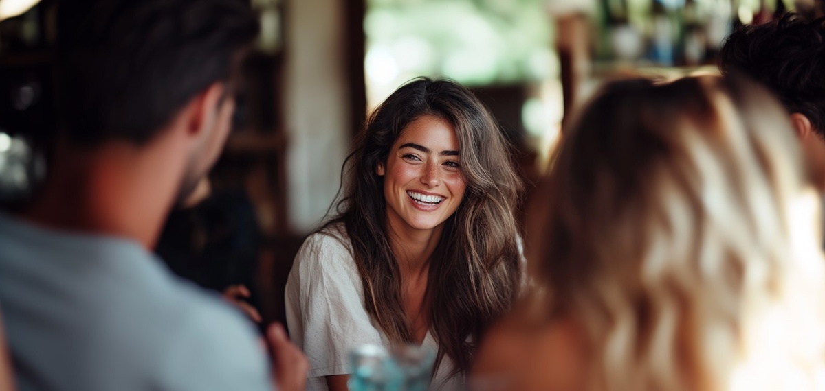 Создано на основе запроса: A realistic portrait of a 40-year-old woman with long, flowing Latin hair, warm brown skin, expressive eyes, and a soulful, grounded presence. She has natural beauty with minimal makeup and wears a soft, simple blouse or outfit. she is laughing with friends all talking around a tablebut you can only see the side of her face. realistic photo in an english bar with friends --- Автоперевод: Реалистичный портрет 40-летней женщины с длинными, плавными латинскими волосами, теплой коричневой кожей, выразительными глазами и душевного, обоснованного присутствия. Интересно вышло? 🤔 https://dzen.ru/id/65c0c65c86e4f837c27b24d7 #ИИ #AI #нейросеть #midjourney #art