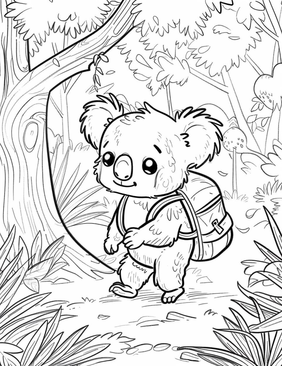 Создано на основе запроса: A simple black-and-white coloring page for toddlers (3 years old) showing a cute cartoon koala waking up in a tree. A tired koala walking slowly with a backpack. Thick outlines, simple pose, no background.