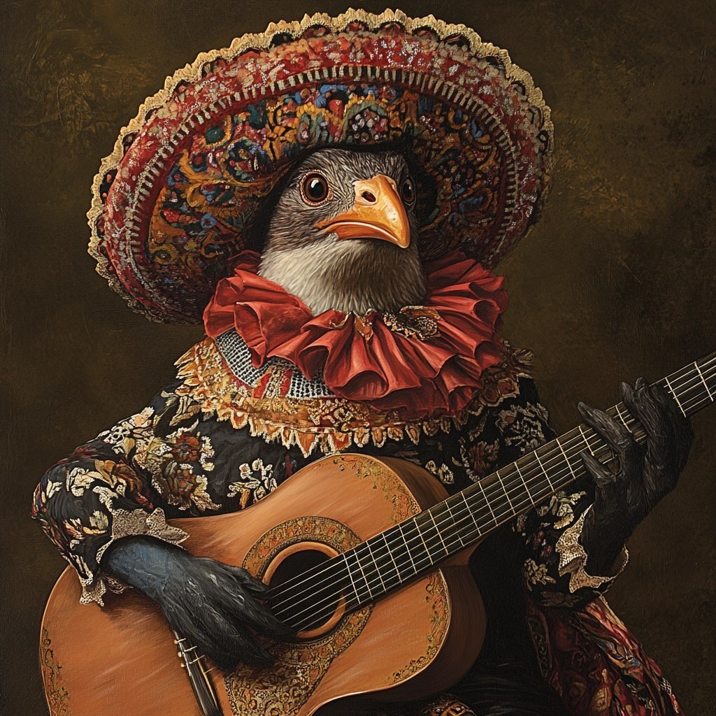 Создано на основе запроса: an guinea fowl with an Mariachis costume and haut playing guitare. --- Автоперевод: Гвинея -птица с костюмом Мариачи и волосами, играющей на гитаре. Отлично вышло? 🤔 https://dzen.ru/id/65c0c65c86e4f837c27b24d7 #ИИ #AI #нейросеть #midjourney #art