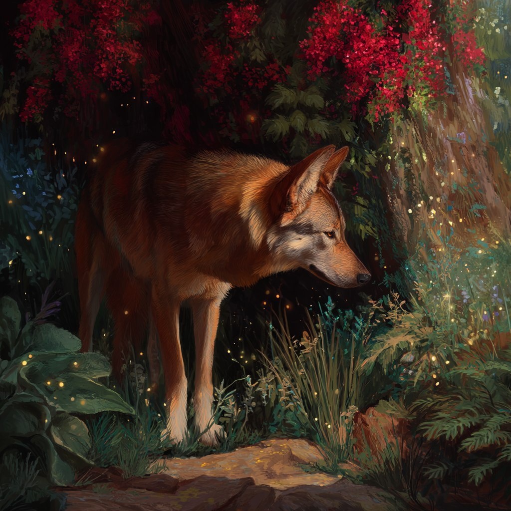 Создано на основе запроса: A red wolf in an enchanted forest