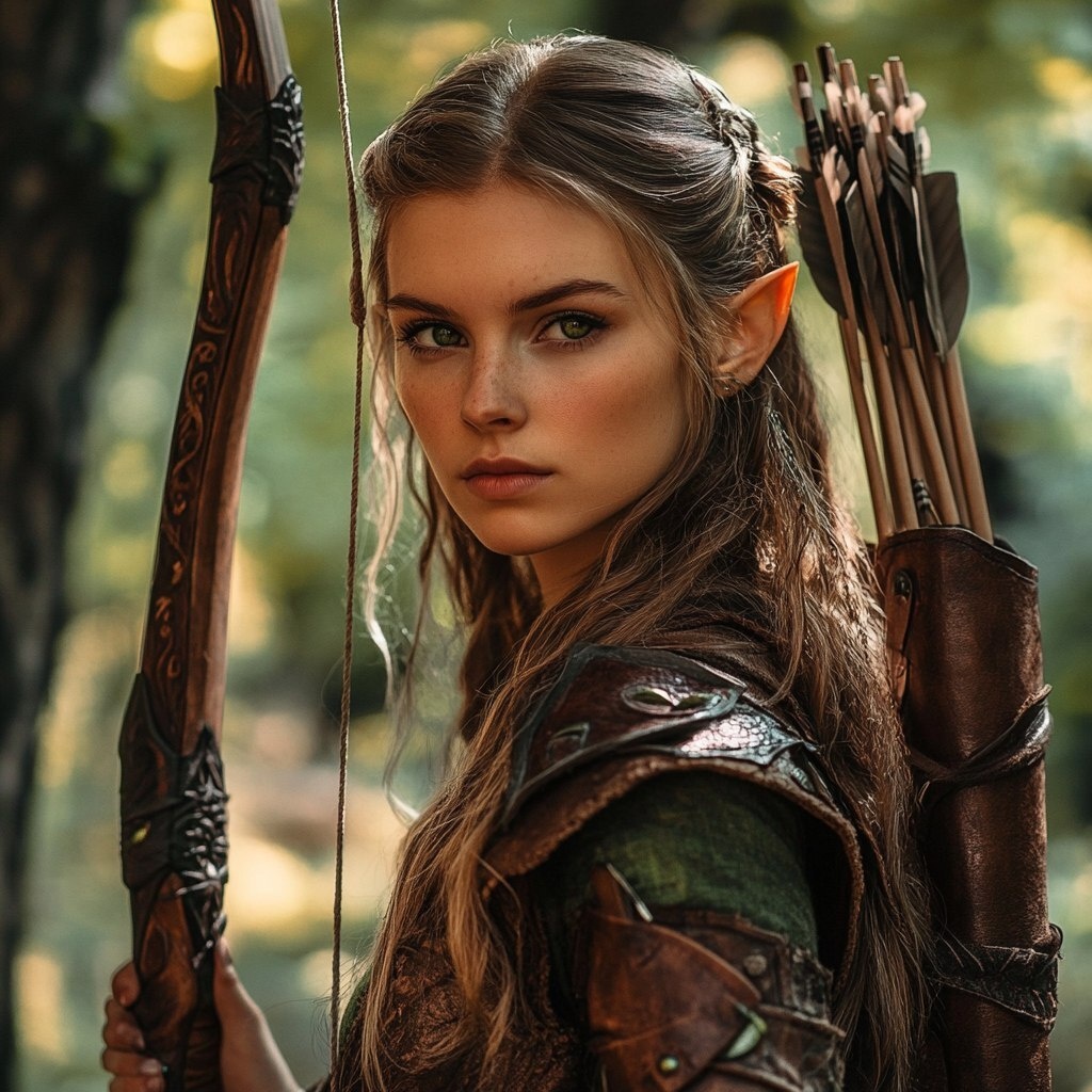 Создано на основе запроса: female wood elf, hide armor, holding a long bow, light brown hair with green streaks, green eyes, fantasy