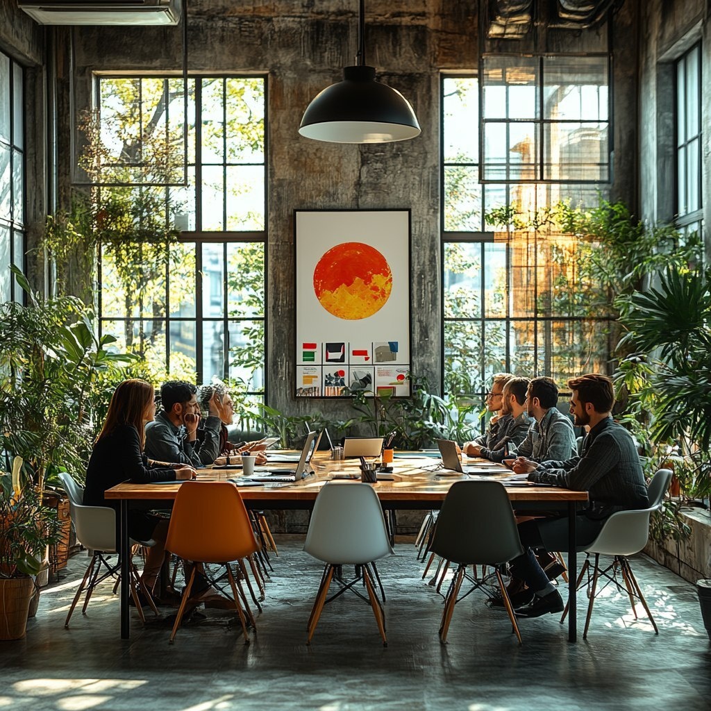 Создано на основе запроса: a casual confrance board room with 7-10 thought leaders, showcasing global leadership experience across Japanese
