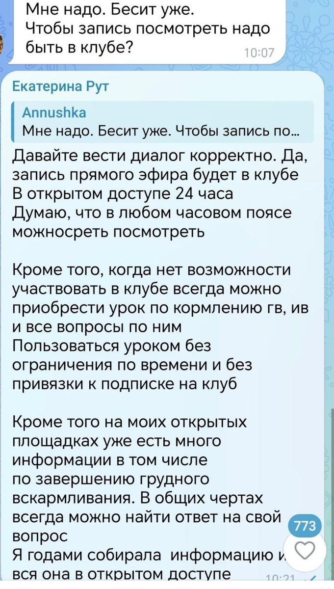 🎈Друзья! В нашем сообществе есть элементарные правила, соблюдая которые мы создаем комфортную атмосферу для самих себя. ⭐️Уважение — первое из них. «Меня бесит» заменяем на: К сожалению, я не успеваю посмотреть запись эфира в течение 24 часов. Можно ли оставить запись в открытом доступе на 2 дня? Или: У меня нет возможности участвовать в клубе. Какие еще есть варианты для изучения темы ГВ? И т. д. Согласитесь — так намного приятнее для всех и! Так становится понятно, в чем причина негодования — мне будет проще найти решение. ⚠️Однако на будущее. Подобного рода высказывания пресекаются одним замечанием. В следующий раз — черный список. Надеюсь на ваше понимание и согласие. 🤝