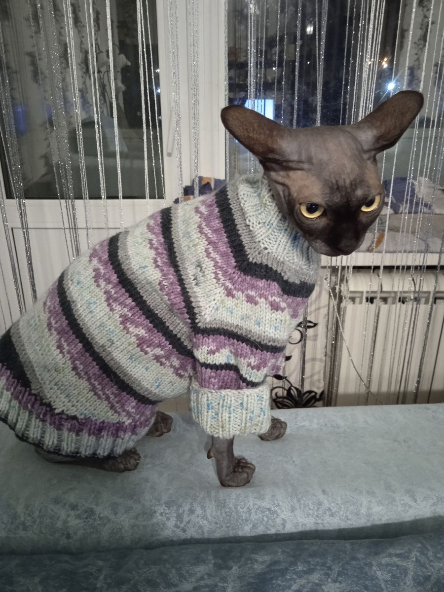 Демонстрация нового свитера. Модель очень даже "не в голосе")))) Ничего не отгрызла и ладушки!! Лучший свитер для нее, это когда она голенькая. И не важно, что пятая точка уже инеем покрыта)))