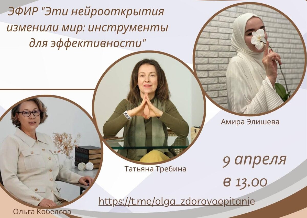 🌟 Не упустите шанс изменить свою жизнь! 🌟 Уже 9 апреля в 13:00 вас ждёт уникальный эфир, где эксперты раскроют секреты эффективности на основе последних нейрооткрытий! 🔥 Что вас ждёт? ✅ Татьяна Требина , специалист по личностному росту, поделится инструментами для управления временем и стрессом. ✅ Ольга Кобелева , практикующий нейропсихолог, расскажет, как тренировать мозг для достижения целей. ✅ Амира Элишева , эксперт по продуктивности, покажет, как применять нейронауки в повседневной жизни. 🧠 Узнайте, как: Перестать тратить энергию попусту; Фокусироваться даже в хаосе; Достигать результатов без выгорания. ⏰ Дата: 9 апреля ⏰ Время: 13:00 🔗 Ссылка: https://t.me/olga_zdorovoepitanie 🚀 Этот эфир изменит ваш подход к работе и жизни! Присоединяйтесь — места ограничены! #НейроОткрытия #Эффективность #ЛичныйРост #Продуктивность #МозговойШтурм P.S. Поделитесь этим постом с друзьями — пусть они тоже станут частью изменения мира! 💡✨