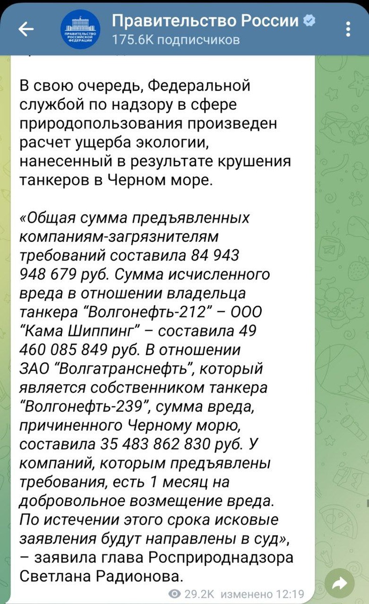 Росприроднадзор озвучил сумму требований к владельцам танкеров, затонувших в Черном море Владельцы затонувших в Черном море танкеров, перевозивших мазут, должны выплатить в общей сумме 84,9 млрд рублей в качестве возмещения ущерба по ситуации. На добровольную выплату средств у них есть месяц, сообщили в Росприроднадзоре. «Общая сумма предъявленных компаниям-загрязнителям требований, составила 84 943 948 679 руб. Сумма исчисленного вреда в отношении владельца танкера „Волгонефть-212“ — ООО „Кама Шиппинг“ — составила 49 460 085 849 руб. В отношении ЗАО „Волгатранснефть“, который является собственником танкера „Волгонефть-239“, сумма вреда, причиненного Черному морю, составила 35 483 862 830 руб», — заявили в федеральной службе. Информацию передает правительство РФ. Я даже скриншот сделал. Все таки поставили их на бабки!