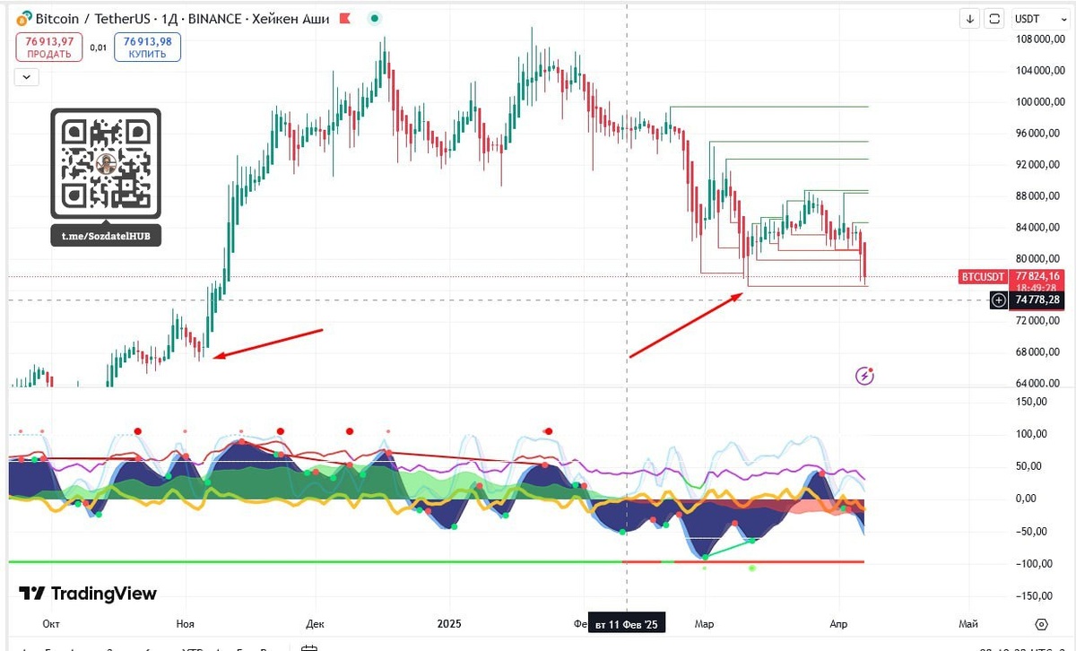 Собрали ликвидность на уровне 77к. Дальше логичнее сходить ниже к 76-75.500 - за стопами лонгистов. Затем сбрить шортистов резким пампом цены к 85-86к. И снова вниз к 70к. тем более, что по движению капитала - биток не особо откупают на ТФ 4ч. Так вижу! |HUB|