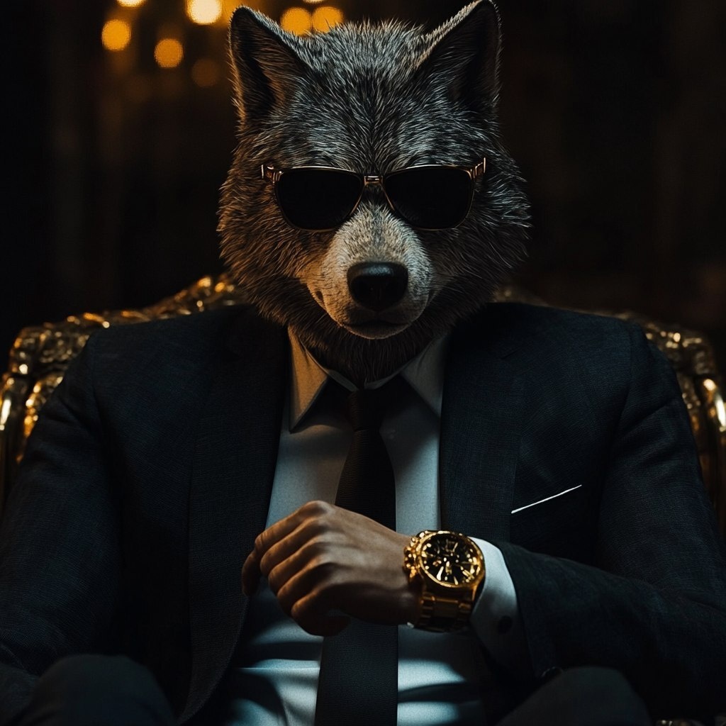 Создано на основе запроса: make me an imagen of a wolf with black sunglasses retro pristol, black suit and black tie, long pointed collar white shirt, gold watch, gold ring of power mobster in the little finger, all in style of goodfellas