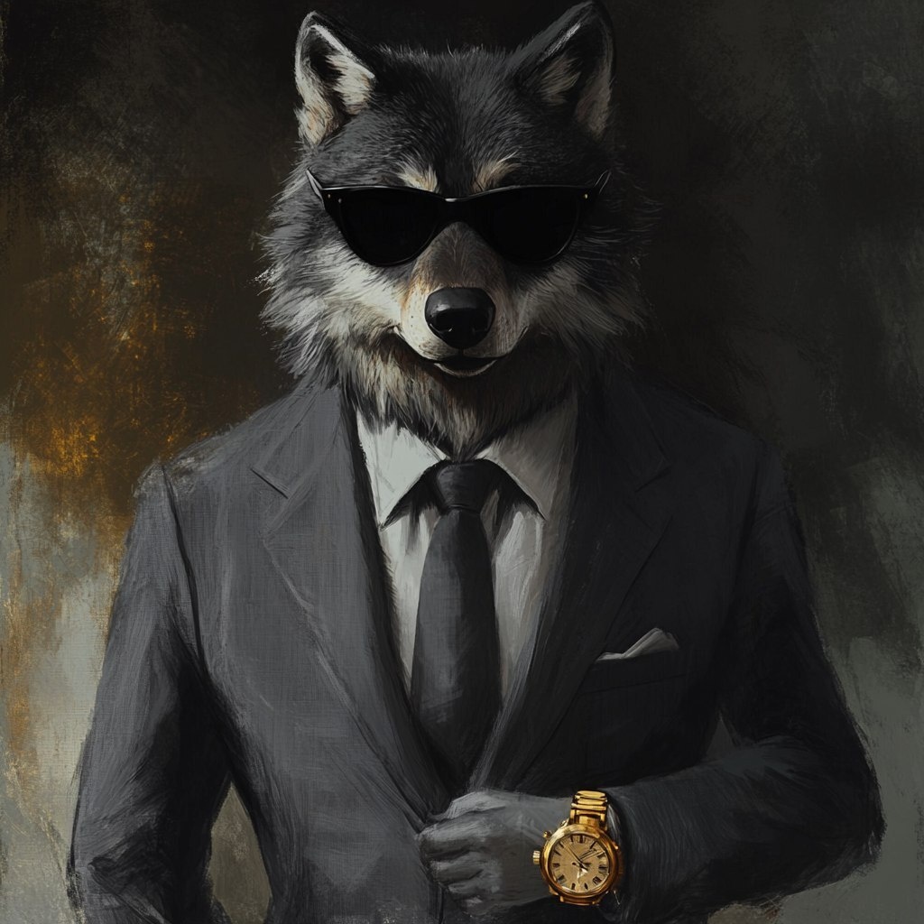 Создано на основе запроса: make me an imagen of a wolf with black sunglasses retro pristol, grey suit and grey tie, long pointed collar black shirt, gold watch, gold ring of power mobster in the little finger, all in style of goodfellas