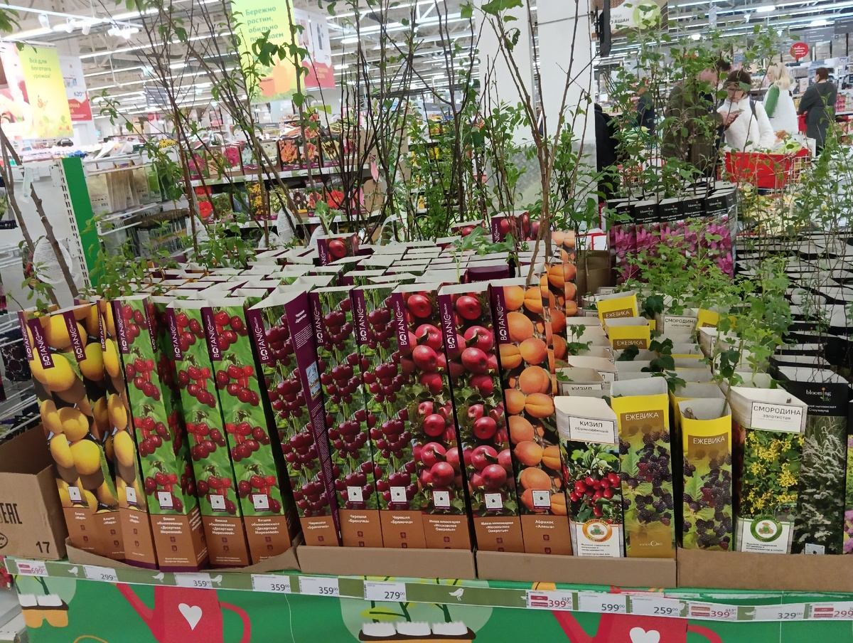 "Ашан" - единственный сетевой магазин, который "сменил гражданство" вместе с Крымом и за это мы его уважаем:). Но расположен далеко от нашего дома и поэтому посещаем нечасто. Вчера цель дальнего похода в торговый центр не была связана с закупкой продуктов на месяц, поэтому заглянули только в садово - огородный отдел. Выбор саженцев плодовых небольшой: Больше цветов, но цены не интересные. Пион вообще один-единственный. Розы по 280-960 руб вообще не интересны. У нас рядом с дачей сплошь частные розовые поля саженцев любых видов и сортов. Мы осенью с поля брали 12 кустов по 130 рублей. Ещё плодовые. Но тоже -тут 300 руб по акции, а в магазине Никитского ботанического сада - по 250-300 руб саженцы с соответствием сорта и доставкой на дом. Вот грунт - это супер. Там, конечно, торф в основной массе, но в любом другом магазине 10 литров самого дешеванского - от 150 руб. Нам такой отлично подойдёт - смешиваем с просеянной землей с дачи и получается супер грунт для рассады. Ряды с с