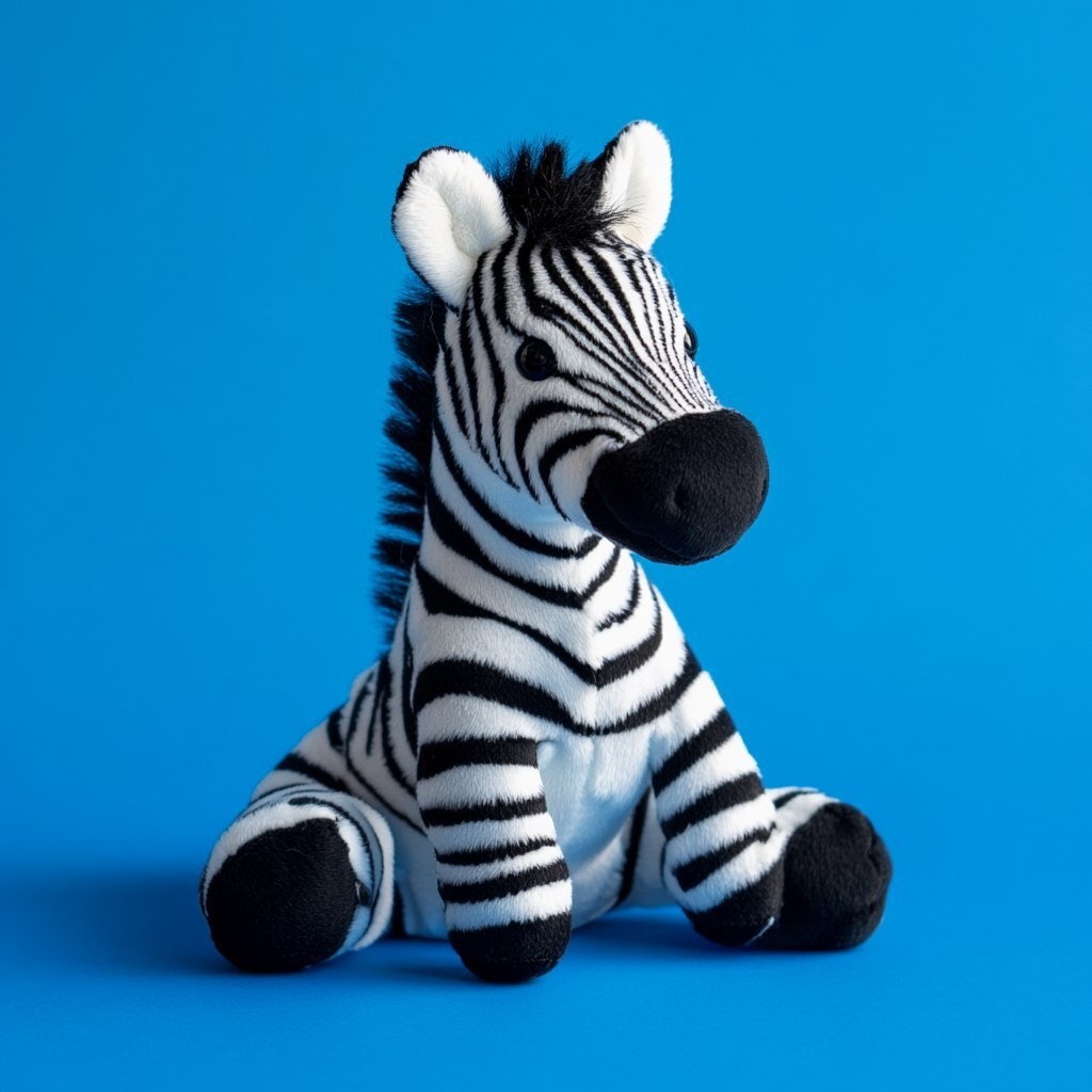 Создано на основе запроса: a zebra toy for babies, zebra stuffed animal on blue background, flash photo, high contrast