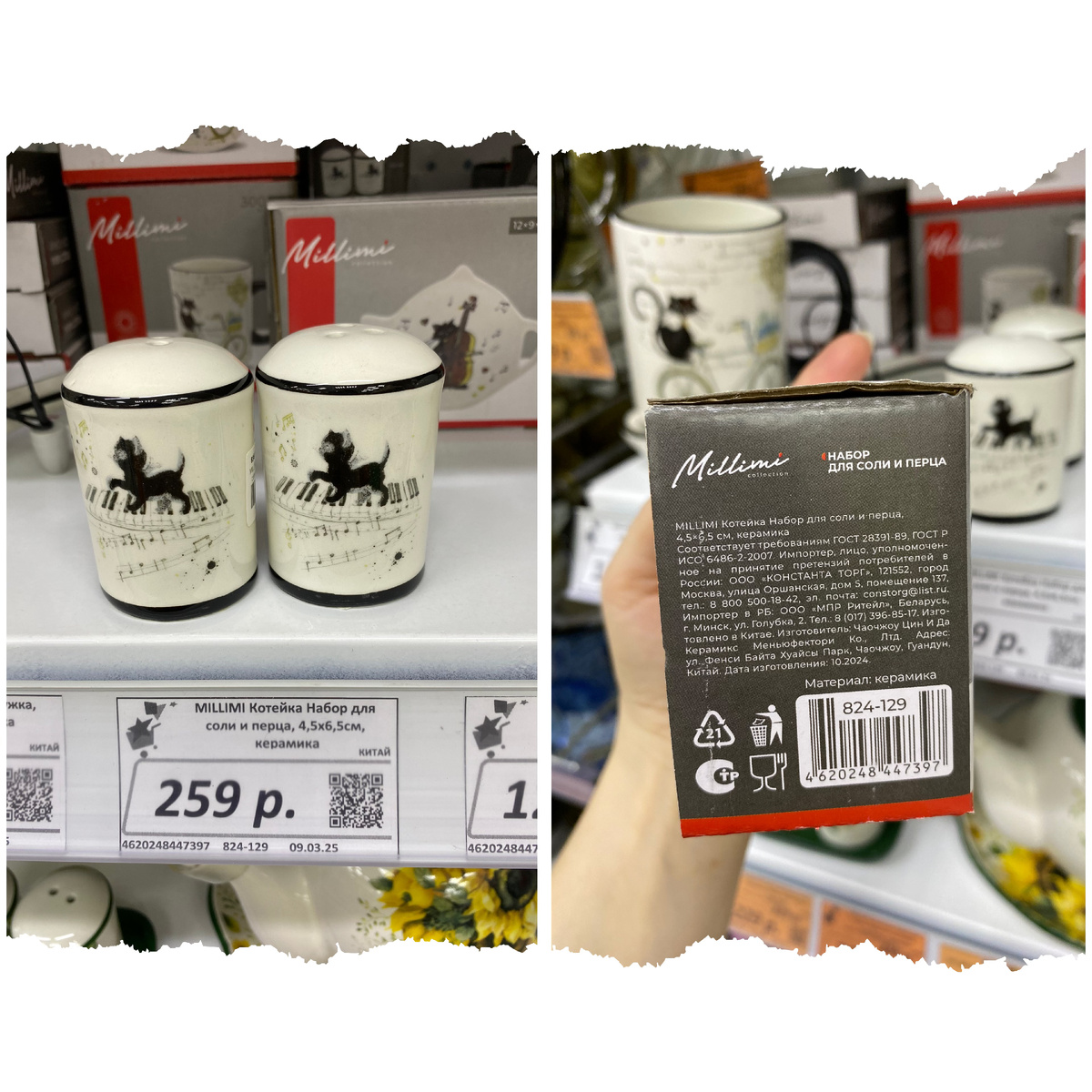Всем привет. Меня зовут Наталья. Я очень рада видеть вас на своём канале. Сегодня мы с вами прогуляемся по магазину Галамарт, который находится по адресу: город Йошкар-Ола, Ленинский проспект, дом 6. В этот раз я вам покажу новую коллекцию посуды с котиками. Так что, если вы, как и я, обожаете этих забавных животных, устраивайтесь поудобнее, так как эиа статья вам точно понравится. Набор для соли и перца "Котейка" стоимостью 259 рублей. В наборе перечница и солонка размером 4,5х6,5 см каждая, подставки для них в наборе нет. Состав: керамика. Страна изготовления Китай. Подставка для ложки "Котейка" стоимостью 189 рублей. Её размер 22х7х2,5 см. Состав: керамика. Страна изготовления Китай. Маслёнка "Котейка" стоимостью 499 рублей. Её размер 17х12х8 см. Состав: керамика. Страна изготовления Китай. Банка для хранения "Котейка" стоимостью 379 рублей. Её объём 550 мл, размер 10х13 см. Состав: керамика. Страна изготовления Китай. Сахарница "Котейки" стоимостью 429 рублей. Её объём 500 мл. Сост