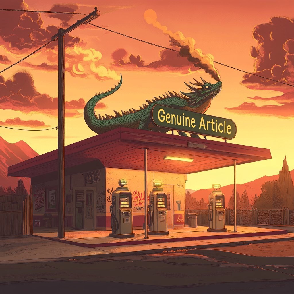 Создано на основе запроса: A cartoon-style 70s gas station glowing at sunset, with "Genuine Article" written on the pump. A cool dragon chilling on the roof wearing sunglasses, smoke curling from its nose. Earth tones, red-orange-gold palette, subtle graffiti in the background.