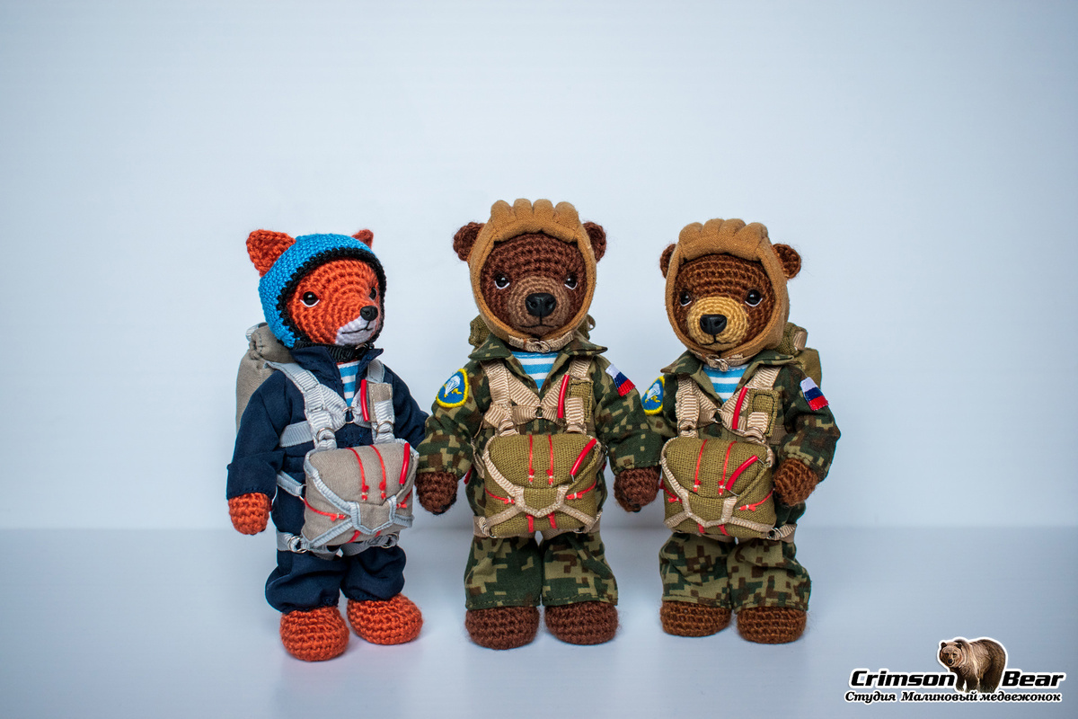 Связаны из акриловой пряжи, лапки на меднопроволочном каркасе. Экипированы парашютными системами Д-6. У медведей нашивки ВДВ. Лис с парашютной системой Д-6. Размер 14 см, подвижные конечности. Устойчиво стоит без опоры, есть возможность подвешивания за специальную петельку. Десантник Размер 15 см, подвижные конечности. Устойчиво стоит без опоры, есть возможность подвешивания за специальную петельку. Парашютная система Д-6. Нашивки ВДВ и флаг РФ.