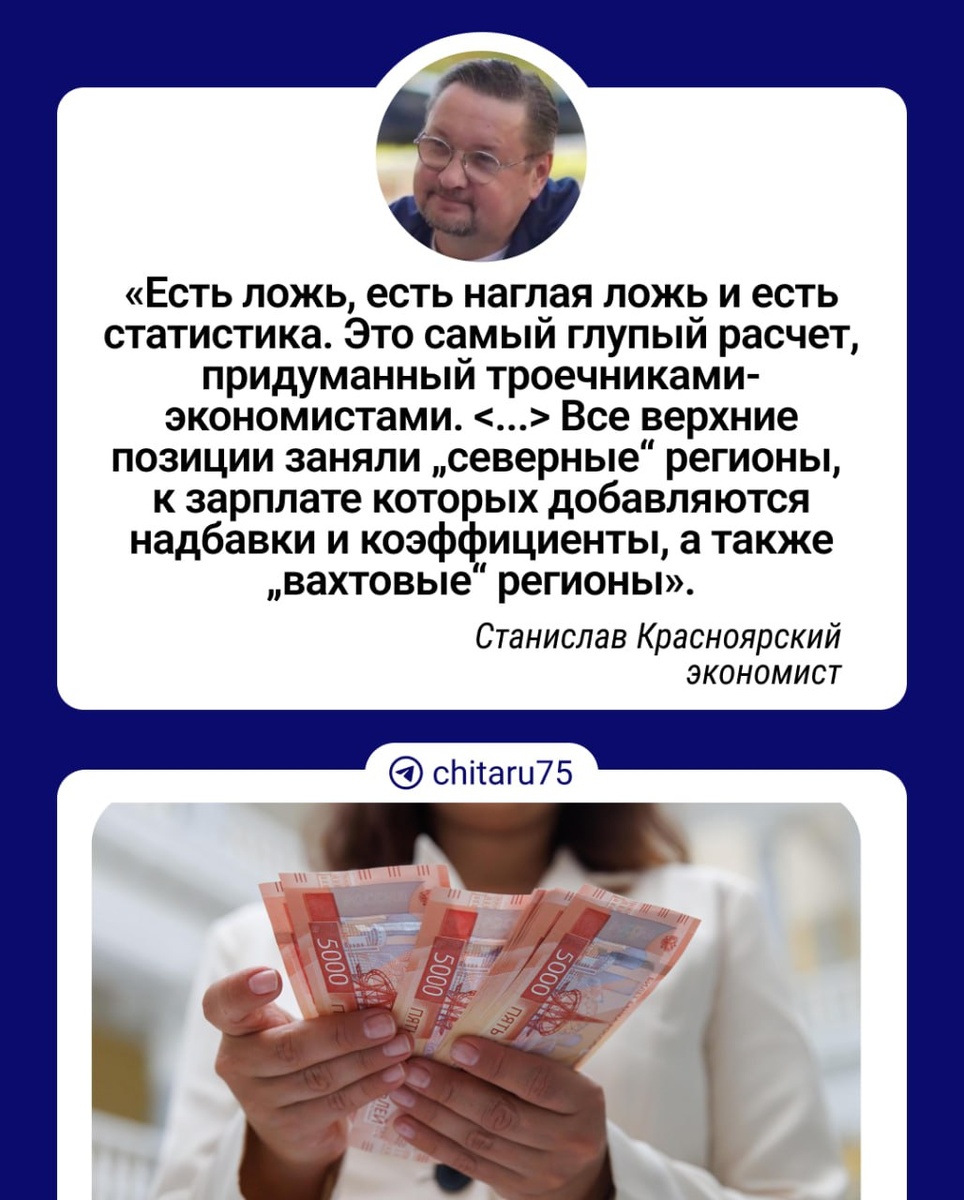 В ответ на пост Забайкальцы в шоке от рейтинга, где средняя зарплата в крае перевалила за 130 тысяч рублей. Фонд развития гражданского общества сделал рейтинг регионов России по уровню социального благополучия. Аналитики посчитали, что средняя зарплата в Забайкалье — почти 133 тысячи рублей. В рейтинге регионов по индексу край оказался на 11-м месте после Санкт-Петербурга. Индекс считали по средней зарплате к расчету минимальной стоимости жизни — это базовый набор продуктов, товаров и минимум необходимых услуг на одного человека в месяц. На 1 января базовую сумму для жизни одного человека оценили в 24 041 рубль. В комментариях под этим постом подписчики спрашивали, как переехать в Забайкальский край с такими зарплатами. Или удивлялись, как быстро цифры на бумаге растут: У нас, если откинуть вахтовиков и военных, средняя зарплата будет тысяч 40. А цены на всё поднялись, как будто люди и правда каждый по 100 тысяч рублей получают. 🟦Подписаться | Предложить новость