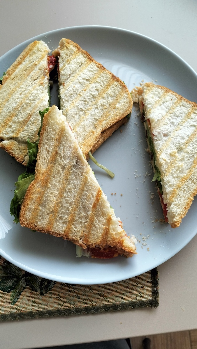 Воскресенье прошло, словно и не бывало. У меня опять насморк, состояние разбитое, делать ничего не хочется. Ну, я и не делала. За весь день только еду приготовила и посуду помыла. А, ещё за заказом сходила (кошке корм), долго мне было лень, а когда в конце концов собралась, на улице ливень пошёл. Пришлось обратно переодеваться. А теперь подробности про меня как любительницу поесть. Утро началось с завтрака Решила сделать себе бутерброды (или сендвичи, если красиво обозвать). Внутри помидорки из морозилки, какие-то остатки колбасок оттуда же, сыр и лист салата. Ну и к этой прелести, естественно, кофе, куда ж я без него. Про обед я гадала 2 дня, хочу супчик, но мясного ничего на суп не осталось, и рыбного тоже, и даже консервы почти закончились (есть тунец, печень трески и шпроты, не думаю, что суп из них получится. Нет, суп, конечно, получится 😂 но насколько он будет съедобный, это уже большой вопрос. Из тунца, знаю, можно сварить, но я его на салат хочу). А супчик хочу... Вспомнил