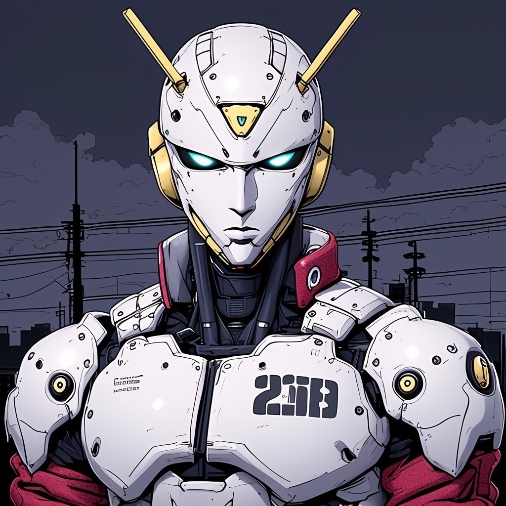 Создано на основе запроса: humanoid mecha robot with white armored helmet, glowing cyan eyes, gold V-shaped antennae, red and white shoulder armor, navy blue and red mechanical chest plating, numbered kanji insignia on the chest, ultra-detailed robotic compartments, heavy plating and tubing, high contrast anime ink lines, cel-shaded, clean lighting, dark grey background with city silhouette --- Автоперевод: гуманоидный мех-робот с белым бронированным шлемом, светящимися голубыми глазами, золотыми V-образными антеннами, красным и белым плечевым доспехом, темно-синим и красным механическим грудью, пронумерованным знаком кандзи на груди, ультра-разлученные роботизированные роботи Классно выглядит? 🤔 https://dzen.ru/id/65c0c65c86e4f837c27b24d7 #ИИ #AI #нейросеть #midjourney #art