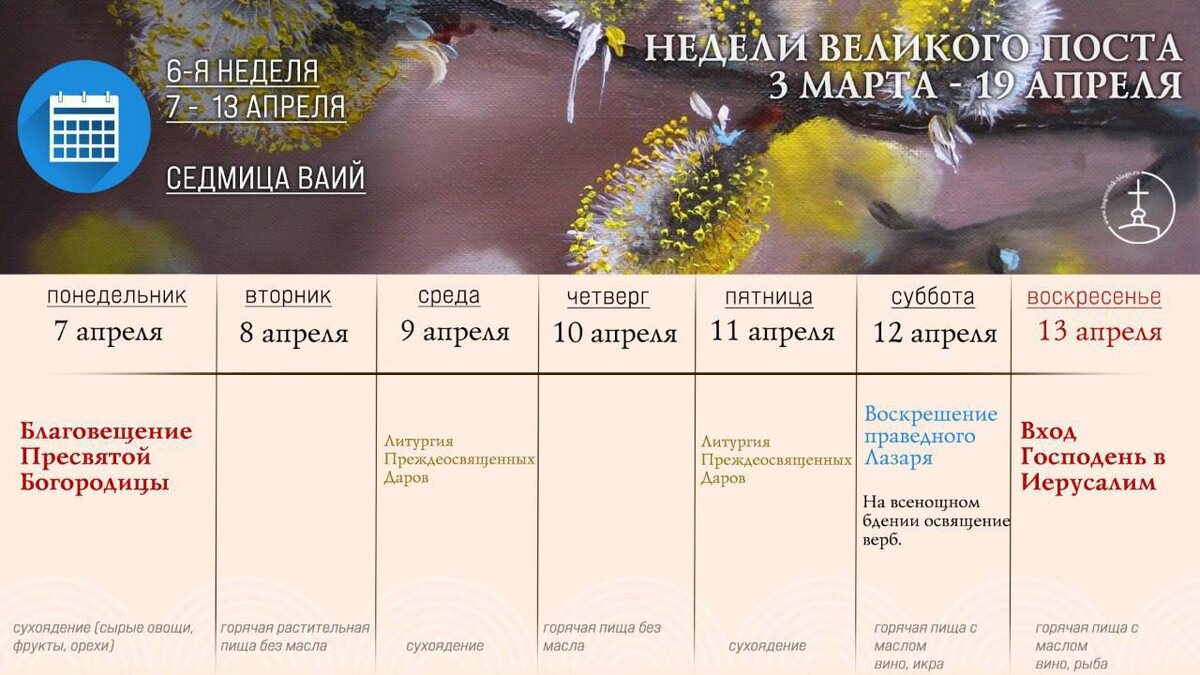 6-я седмица Великого поста имеет особое название — «седмица ваий». Это последняя седмица Четыредесятницы — сорокадневного периода, установленного для борьбы с грехами и покаяния. Далее наступит Страстная седмица — совершенно особый период, когда мы максимально сосредоточены на событиях последних дней земной жизни Иисуса Христа. В 2025 году на понедельник 6-й седмицы выпадает празднование Благовещения Пресвятой Богородицы. В среду и в пятницу служится Литургия Преждеосвященных Даров. В пятницу на седмице ваий святая Четыредесятница кончается, мы стоим в преддверии Страстной седмицы. В субботу празднуется воскресение праведного Лазаря. Церковь прославляет его как доказательство Божественной силы Иисуса Христа и как удостоверение в воскресении Христа и в общем воскресении всех умерших. Вечером в этот день, за всенощным бдением, совершается освящение верб. Воскресенье этой недели посвящено воспоминанию Входа Господня в Иер