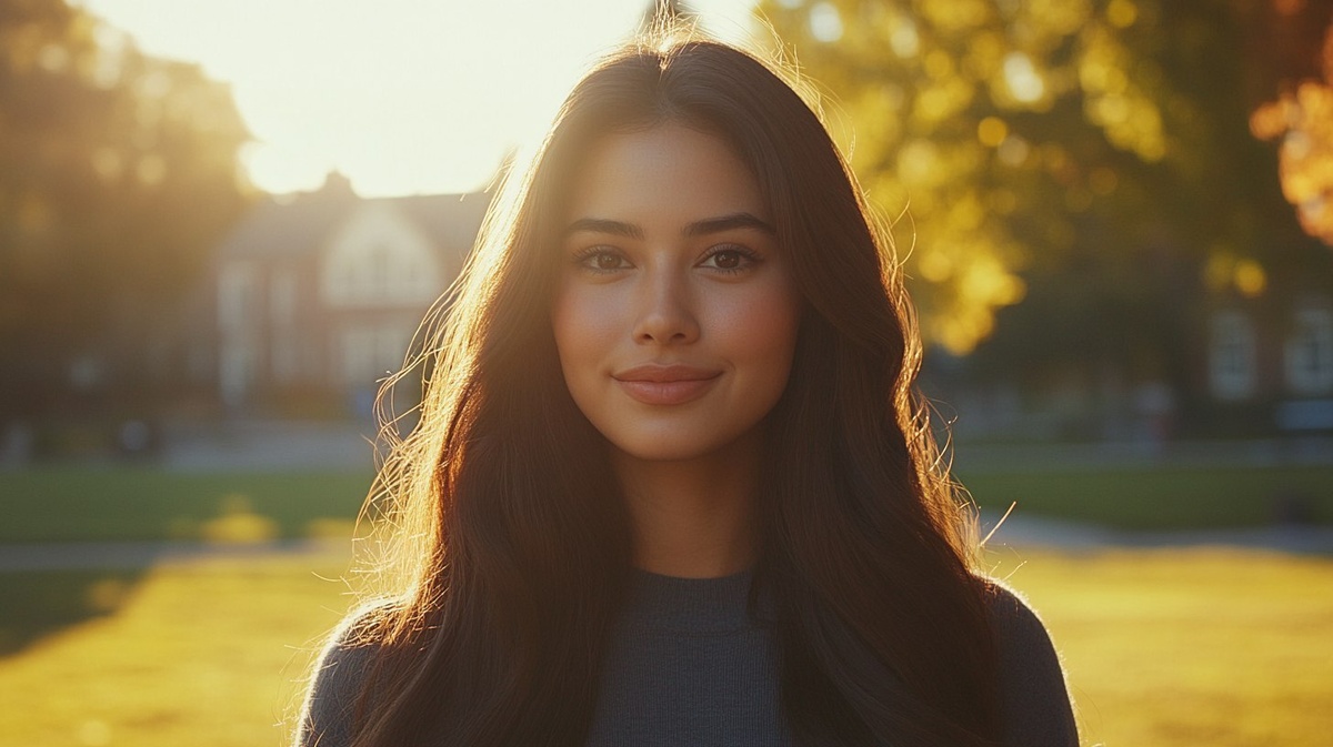 Создано на основе запроса: A stunning 21-year-old Hispanic American college student, wearing modern casual campus fashion, long flowing dark hair, glowing warm brown skin, soft makeup, confident yet thoughtful expression, standing on a vibrant university campus in golden hour lighting, cinematic depth of field, photorealistic, natural sunlight, 4K