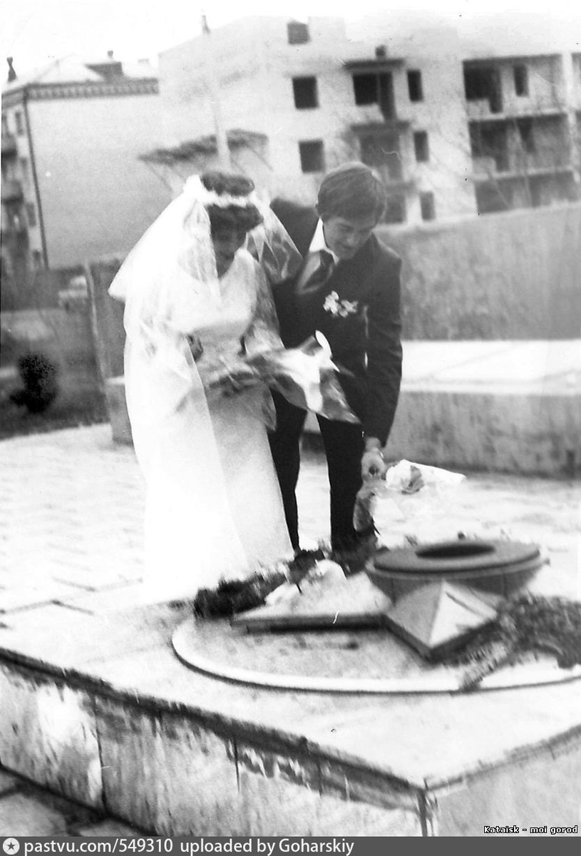 Катайск. У Вечного огня Описание: Свадьба Пайвиных. Снимок сделан 18 октября 1981 года. На заднем плане виден строящийся дом Ленина, 223. 1981, Россия, Курганская область, Катайский район Автор: Из личного архива Е.А.Богоявленских https://vk.cc/cKyVvG