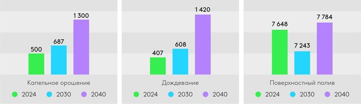 Дальнейшее качественное развитие сельского хозяйства требует совершенствования ирригации и поиска новых путей эффективного использования воды. Важную роль в Центральной Азии играет ирригационное оборудование, помогающее фермерам более эффективно использовать воду. Кроме того, регион планирует увеличить площадь капельного орошения с 500 000 до 1 300 000 га, дождевания - с 407 000 до 1 420 000 га, а поверхностного орошения - с 7 648 000 до 7 784 000 га к 2040 году. Это приведет к дальнейшему росту спроса на ирригационное оборудование.