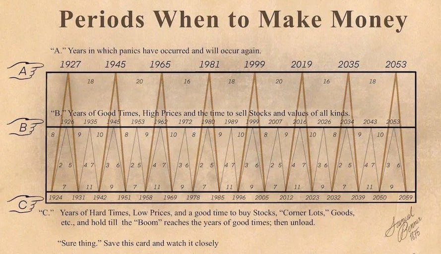 💰 When to cash in? 🔮 What if a 150-year-old chart is hinting at the next bull market peak... in 2026? 😳 🕯 Meet Samuel Benner, a farmer who got wrecked in the Panic of 1873. He dedicated his life to studying those market cycles. His chart, first shared in 1875, suggests buying during "hard times" and selling when things are looking rosy. 🎢 According to Benner’s cycle, 2023 was prime time for good prices—aka the bottom of the bear market. His next prediction? Market top in 2026. 🙏 That gives us one more year if history decides to repeat itself. Sounds wild? Sure. But remember: markets are more than just numbers; they’re all about mood, memory, and momentum. And sometimes those quirky old charts work—not because they’re magical, but because enough folks believe they do! 🤫 📌 Save this chart for future reference!