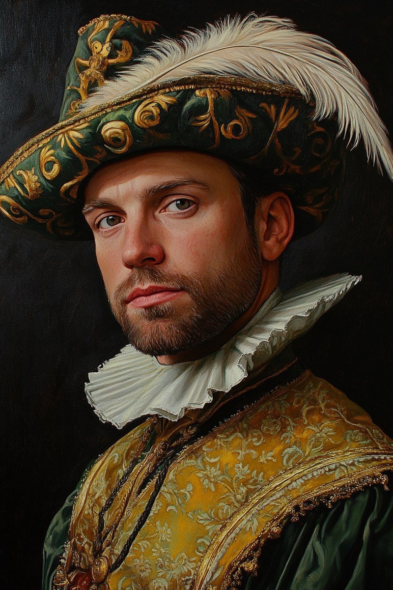 Создано на основе запроса: portrait of a man wearing a Robin Hood hat with a plume in it