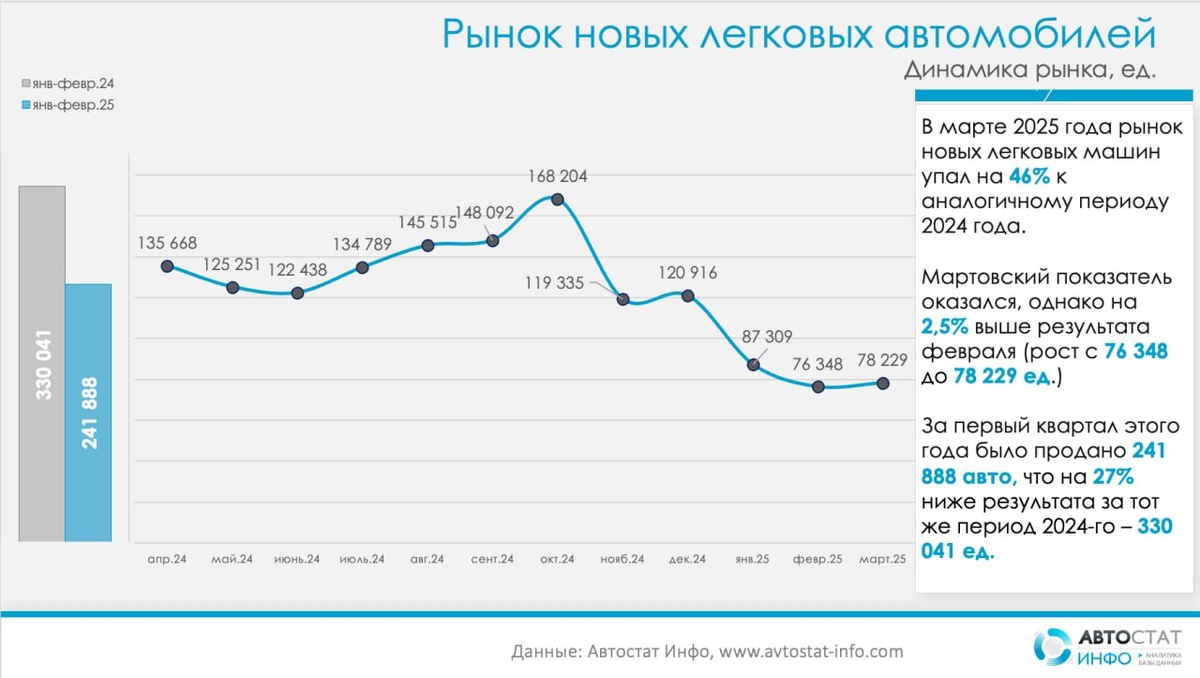 Продажи новых автомобилей в марте упали на 46% к прошлому году, но выросли на 2,5% к февралю По новым данным статистики «Автостат Инфо», продажи новых легковых автомобилей в России упали в марте 2025 года на 46% к аналогичному периоду прошлого года, когда было реализовано 145 892 авто, и составили 78 229 машин. В указанный период сократились продажи как российских моделей (34% до 28 946 ед.), так и иномарок, которые продемонстрировали 52-процентный спад (до 49 283 ед.). Рыночные доли между этими сегментами распределились как 37% и 63% соответственно. За первый квартал 2025 года объем рынка новых легковых машин снизился на 27% к аналогичному периоду прошлого года - с 330 041 до 241 888 ед. соответственно. В этот период на 12% до 88 331 ед. упали продажи автомобилей российских марок и на 33% снизились показатели реализации в сегменте иномарок — 153 557 ед. Как отмечают в «Автостат Инфо», в марте после нескольких месяцев непрерывного спада продаж новых легковых автомобилей наметились