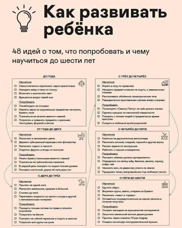 Нашла интересный чек-лист про развитие ребёнка до 6 лет Как вам такие идеи?