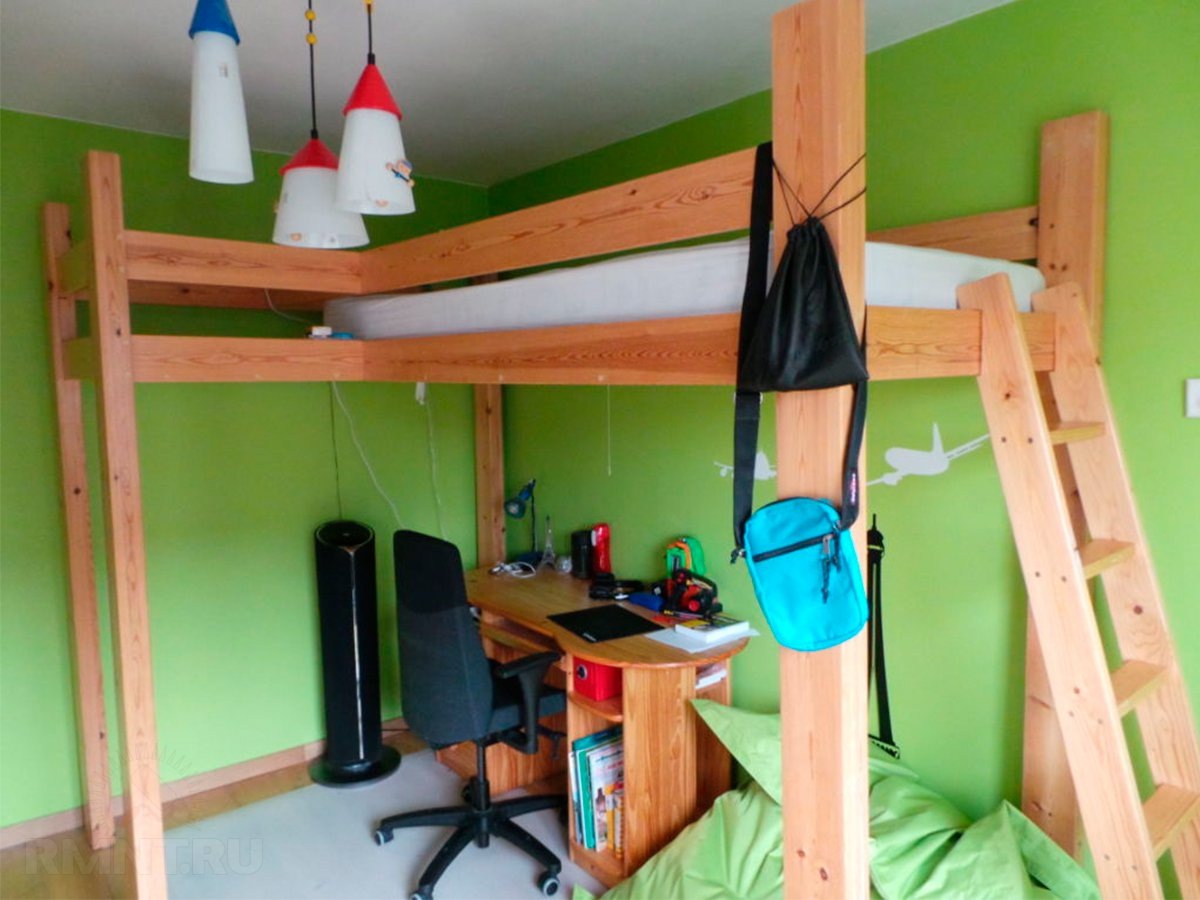 Необычная кровать придётся по вкусу ребёнку куда больше стандартной, особенно если она сделана самостоятельно. Сегодня мы вам расскажем, как можно своими руками сделать детскую кровать-чердак, под которой можно поместить стол для учёбы или шкаф с вещами. Идея подобных проектов в том, чтобы у ребёнка была уникальная кровать, которой точно нет ни у кого. В то же время, когда собираешь мебель своими руками, всегда есть свобода действий и можно воплотить в реальность самые смелые и интересные затеи, которые подойдут лучше всего для ребёнка. Именно о таком подходе и пойдёт речь. Кровать, которую предложено собрать, представляет собой высокую платформу со свободным пространством непосредственно под ней. Забраться на неё можно с помощью приставной лестницы. В качестве интересного дополнения имеется специальная площадка в изголовье. Её может использовать ребёнок для хранения книг или любимых игрушек, с которыми не хочется расставаться даже во сне. В то же время конструкция кровати предельно п