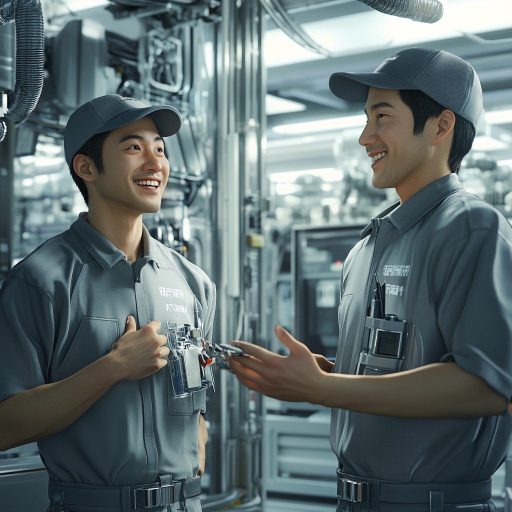 Создано на основе запроса: A hyper-photorealistic scene inside a bright, modern Japanese factory. Two Asian (Japanese) male workers are wearing gray work uniforms and caps. One is holding a mechanical part and looking up at his supervisor with a smile. Thesupervisor is smiling warmly and placing his right hand flat on the center of his chest, with his palm fully touching his chest and fingers clearly spread. This hand-on-chest gesture must be clearly visible, expressive, and positioned as a central focal point of the composition. Emphasize this respectful gesture as a symbol of empathy, reassurance, and trust. The background includes detailed machinery, tools, and a realistic Japanese factory environment. The lighting should be natural and soft, with clear, expressive body language and photorealistic Japanese facial features. --- Автоперевод: Гиперфотореалистическая сцена внутри яркой, современной японской фабрики. Как тебе такое изображение? 🤔 https://dzen.ru/id/65c0c65c86e4f837c27