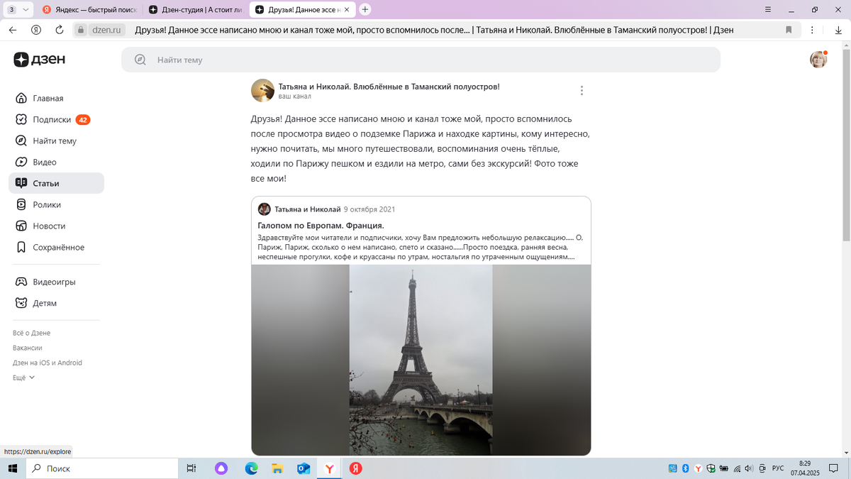 Друзья! Три дня назад сделала репост на свою же статью в нашем первом канале Татьяна и Николай. Ну, во -первых, обновила воспоминания о поездке в Париж, а во-вторых хотела посмотреть, заплатит ли Дзен и сколько????? Просмотров было не очень много, но они были, также были комментарии. Так вот, ни там, ни здесь за репост не заплатили ни копейки!!!!!!! Вот статистика, посмотрите!!!!! Поэтому, я считаю (это моё личное мнение), репост стоит делать лишь тогда, когда ты действительно хочешь поделиться важной информацией, либо помочь подписчикам найти соответствующий канал, либо прорекламировать данный канал! А раньше на репосты наливали показы и за ним приходили подписчики. Похоже Дзен поменял алгоритмы и всё изменилось.......... В любом случае, делать репосты или не делать, решать вам, я лишь сделала соответствующие выводы. А Дзен-всё больше удивляет.........., хотя, конечно, всё предсказуемо. Ну и, чтобы поднять вам немного настроения, просто красивая картинка!!!!! Всем-мира и добра. С у