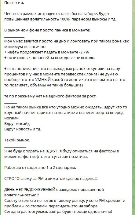 🆘Друзья, вам тоже сразу скину план на день из закрытого ТГ канала. (чтобы вас не кидать в такой не понятный день!) ❗️Факторы ОДНОЗНАЧНО ЗА ШОРТ!!!!!! ❗️Но опираясь на ожидаемую повышенную Волатильность конечно же в рамках интрадея лучше Забор, тк как стоп 0.3% при такой волатильности просто не будет работать. __________ НО!!! После того как инструменты открылись гэпами вниз я отказался от ШОРТА!!! в пользу лудомании на тех отскок. ❗️Понимаю что у нас сейчас нет ни капли позитива!!! Но шортить такие гэпы в рамках интрадея не совсем правильно тк как нет хорошей ТВХ. _________ Сейчас ПОНИМАЯ что у нас НЕГАТИВ и отсутствует какой либо позитив и драйвер роста я в рамках лудомании игнорирую Фон и новости, опираясь на технику посмотрю именно тех отскок. НЕ РОСТ!! А тех отскок. ❗️Тк как в моменте все инструменты УЖЕ прошли свои АТР и ушли вниз паранорм барами, понимаю что на таком рынке АТР, уровни и тк далее не работают, но опираясь на технику с текущих я бы однозначно не шортил. _______