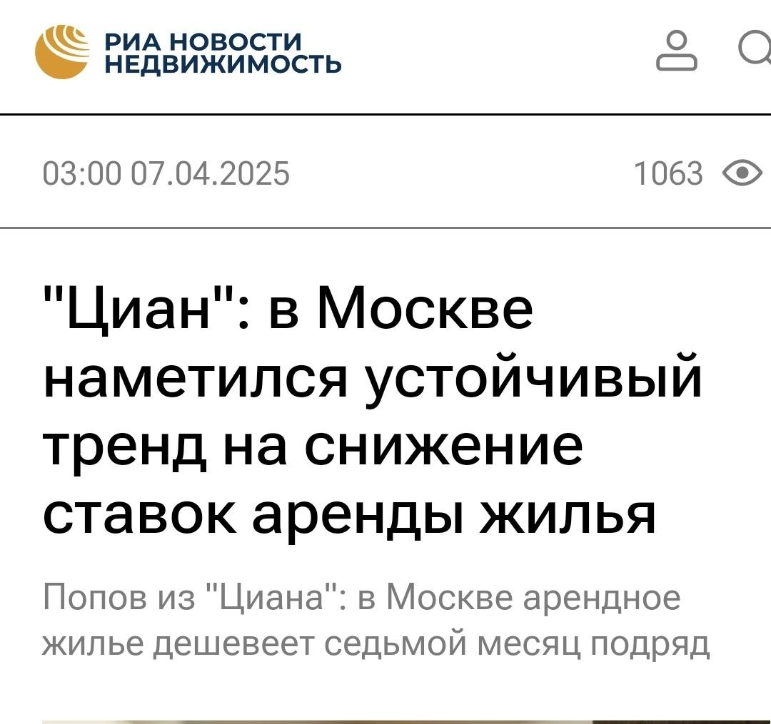 В ответ на пост В Москве арендное жилье теряет в стоимости седьмой месяц подряд, относительно пиковых значений лета 2024 года съемное жилье подешевело в среднем на 10%, рассказал РИА Недвижимость руководитель "Циан.Аналитики" Алексей Попов. « "Ставки аренды в столице снижаются уже седьмой месяц подряд. Столь длительный и устойчивый тренд зафиксирован впервые за пять лет, когда весной 2020 года аренда дешевела на фоне жестких карантинных ограничений первой волны пандемии", - отметил он. А вот про это только я писал и никто больше. И наконец-то первый эксперт поддержал мою мысль о реальной причине снижения цен на аренду- "В марте 2025 года начинает оказывать влияние и новый фактор - замедление экономики страны, которое началось в начале текущего года. До рынка жилья влияние этого фактора начало доходить только к концу первого квартала", - пояснил эксперт. Так что снижение цен на аренду- долгосрочный фактор. Это хорошо для потребителей и очень плохо для "инвесторов" в некоторых. Но эт