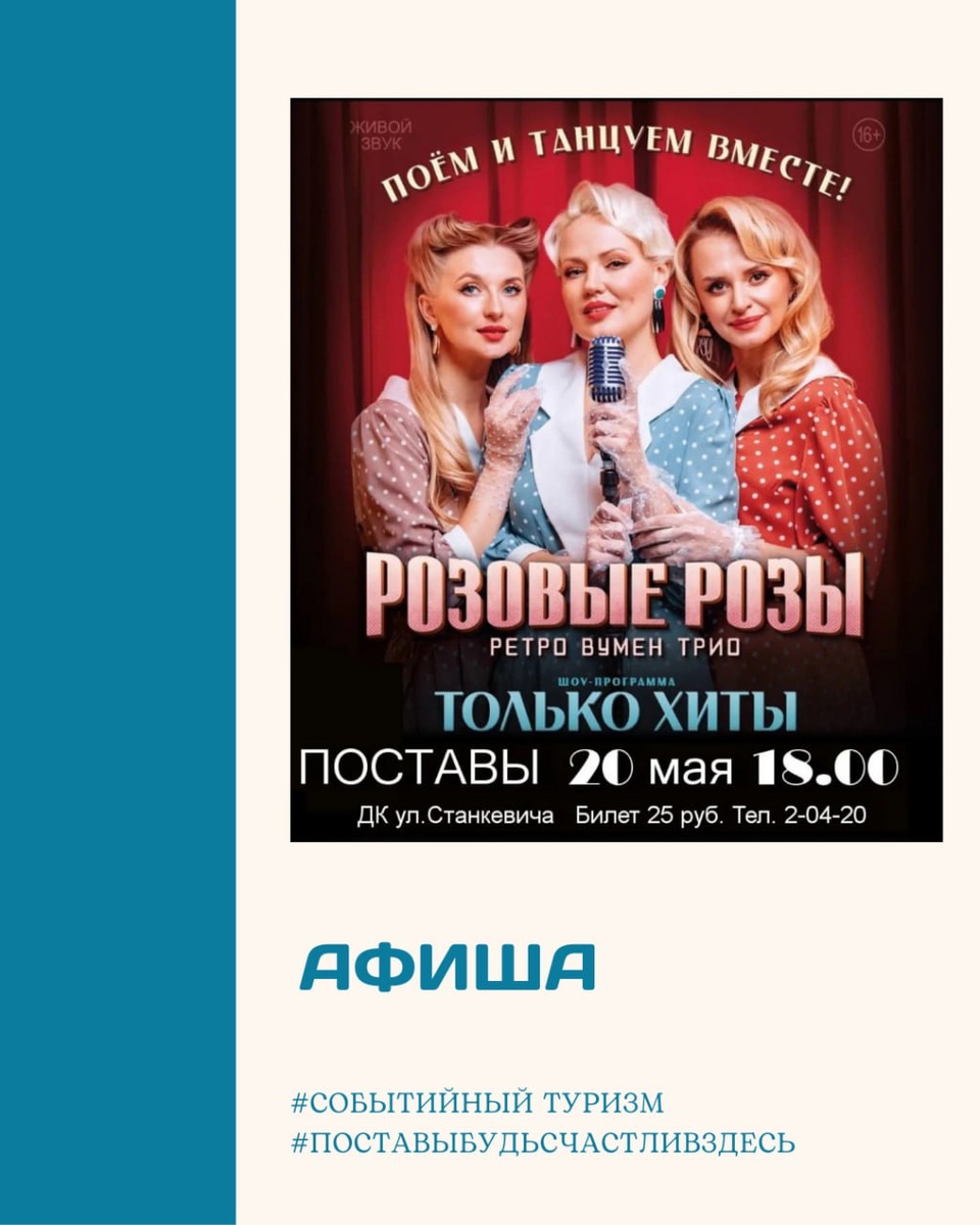 ❗️К нам едут "Розовые розы"❗️с программой "ТОЛЬКО ХИТЫ". Этот женский коллектив уже хорошо известен в Беларуси и успел завоевать сердца своих зрителей. Поют песни советского и раннего постсоветского времени в современных танцевальных оранжировках и оригинальном прочтении. "Вишнёвая девятка", "На теплоходе музыка играет","Младший лейтенант","Мальчик хочет в Тамбов","Чашка кофею","Два кусочека колбаски" и еще много хорошо знакомых песен. Концерт состоится 20 мая в 18.00. Билет 25 руб. Продаются ежедневно без обеда и выходных в Доме культуры по адресу: ул. Станкевича 15А @postavskiirdk Тел.: 25-0-25; 20-4-20. #поставыбудьсчастливздесь #событийныйтуризм #афишапоставы #поставскийрайон