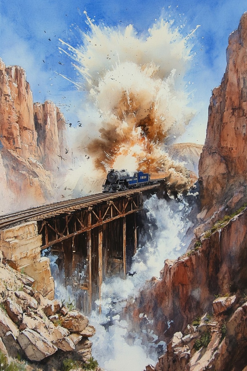 Создано на основе запроса: western painting of a bridge being blown up over a canyon